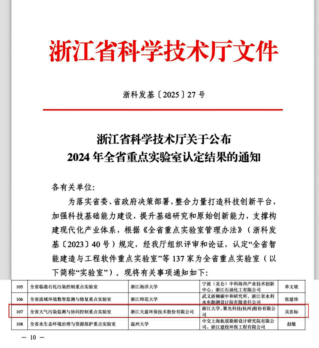 2025年6月4日,浙江省科技廳發(fā)布《浙江省科學(xué)技術(shù)廳關(guān)于公布2024 年全省重點實驗室認定結(jié)果的通知(浙科發(fā)基〔2025〕27號)》,由浙江天藍環(huán)保技術(shù)股份有限公司牽頭,浙江大學(xué)和聚光科技(杭州)股份有限公司共建的“全省大氣污染監(jiān)測與協(xié)同控制重點實驗室”獲批組建,成為全省環(huán)境領(lǐng)域唯一以企業(yè)牽頭建設(shè)的省級重點實驗室。